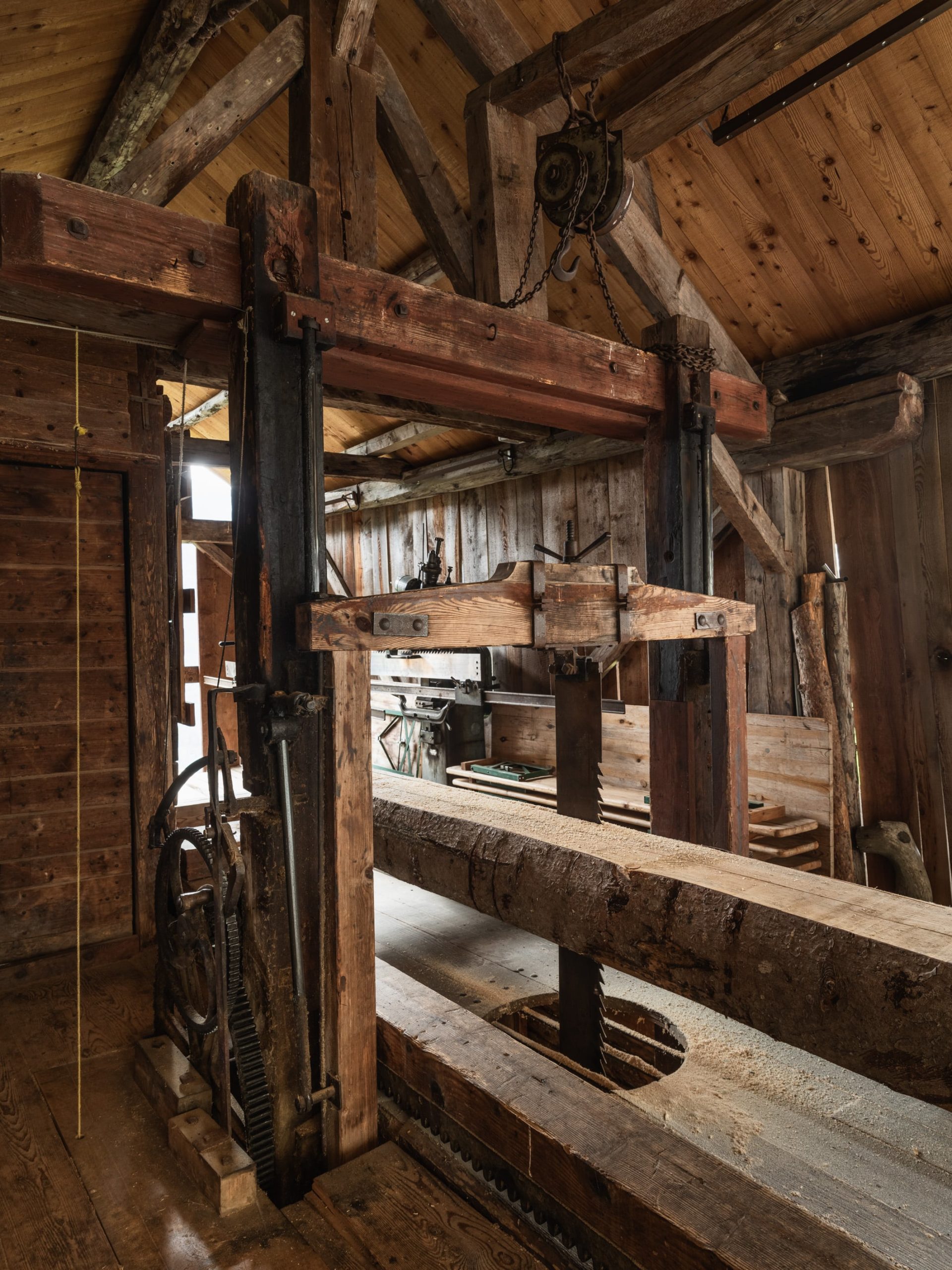 Les moulins du Val de Bagnes étaient traditionnellement actionnés par des roues horizontales. En 1837, les habitants de Sarreyer innovent. Une seule roue verticale actionne une scie et un moulin grâce à des mécanismes ingénieux mais simples.Désaffecté à la suite de l’arrivée de l’électricité et à l’abandon massif de la céréaliculture, l’ouvrage est aujourd’hui entièrement restauré. Classé monument historique depuis 1987, il est mis en activité chaque mercredi en juillet et août. Accompagné par un gardien, plongez dans les entrailles d'un mécanisme vibrant et poétique qui permet de scier de longues billes de bois à l’étage supérieur, moudre du grain ou encore broyer des pommes au rez-de-chaussée.